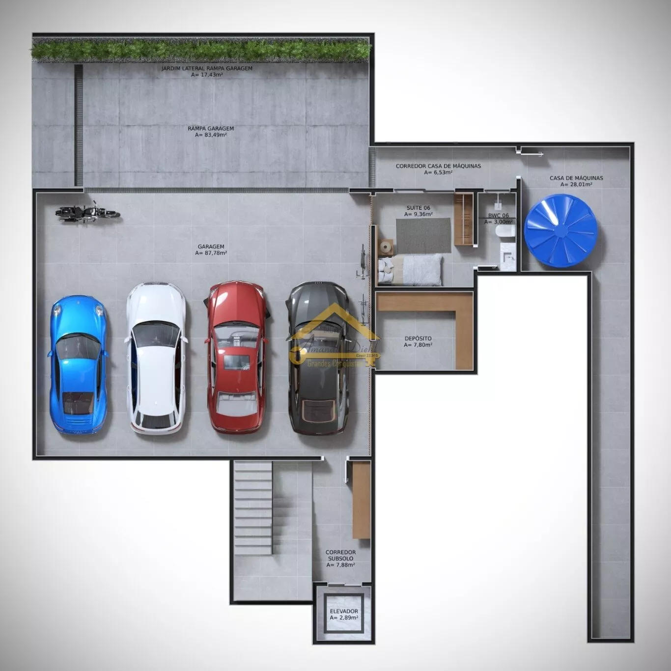 Garagem para 5 carros e moto, com espera carregamento de carro elétrico;