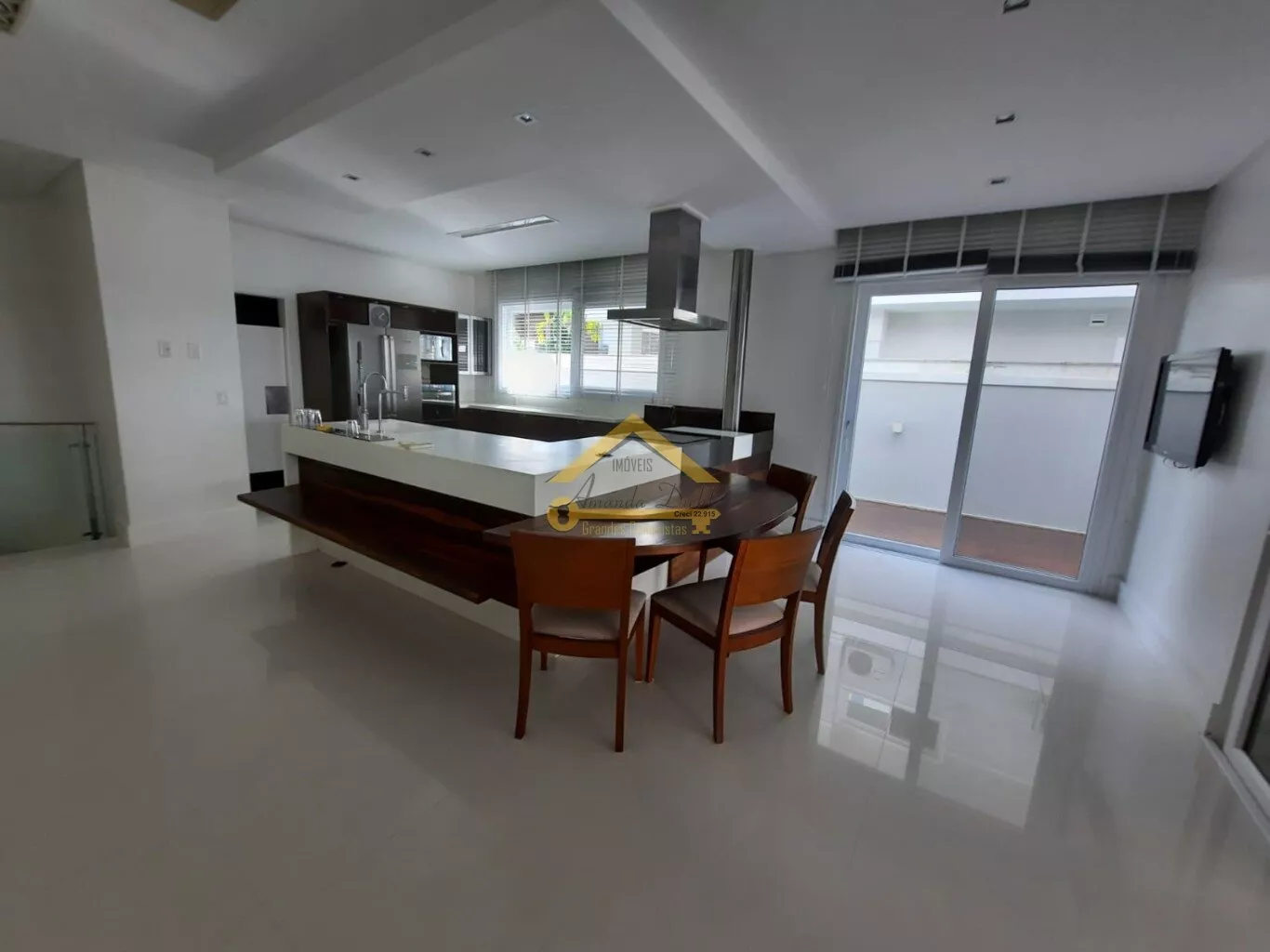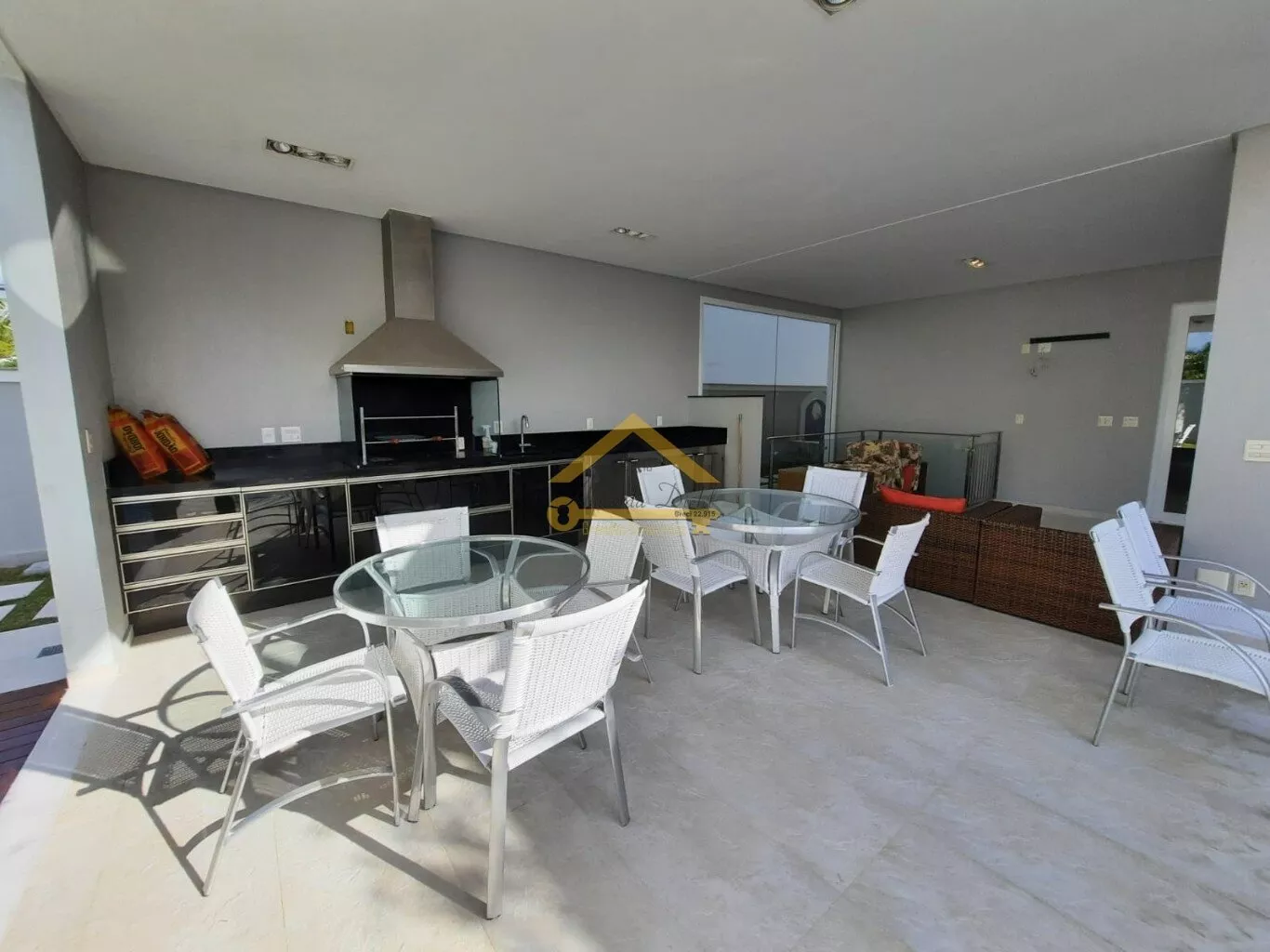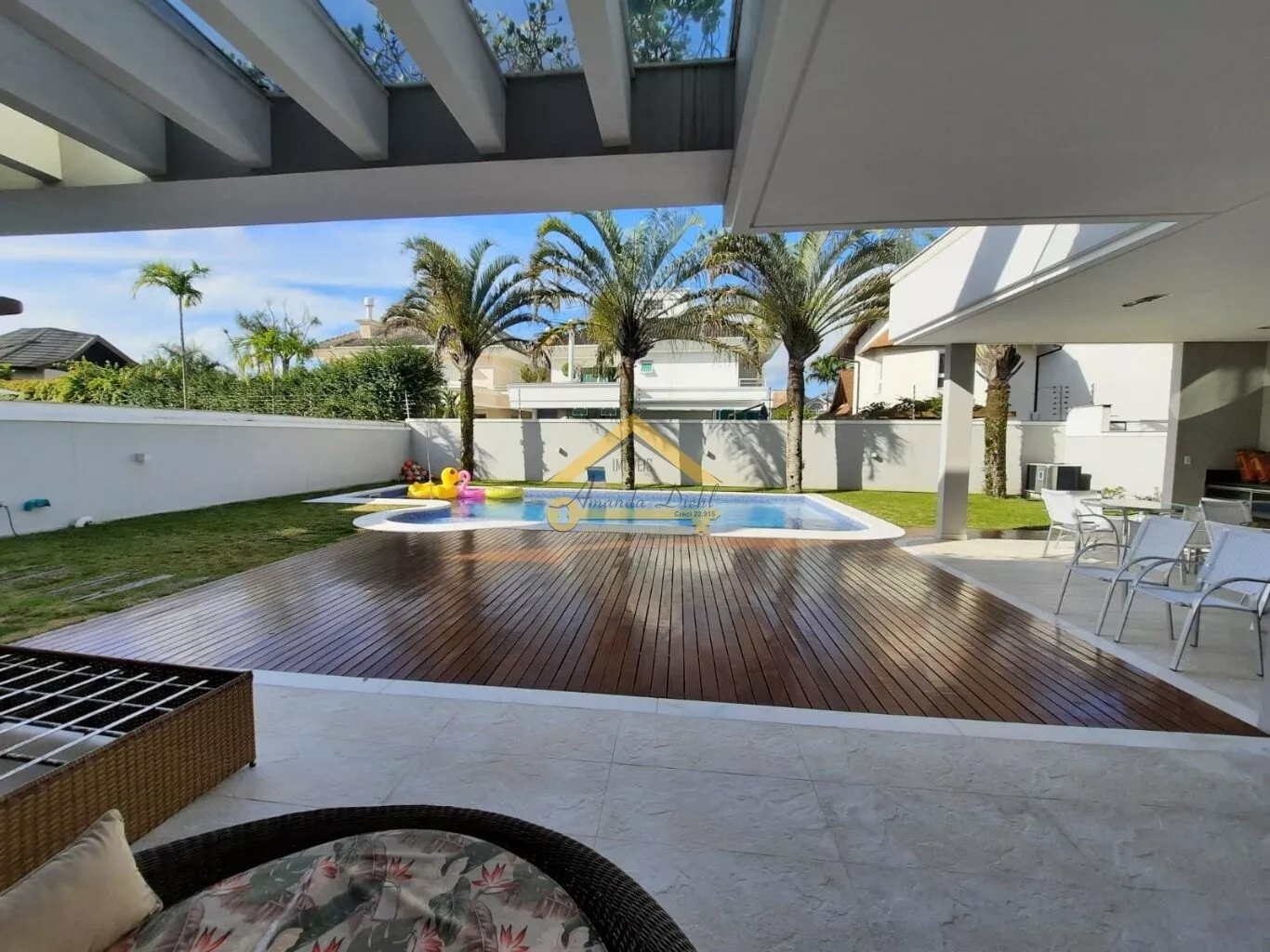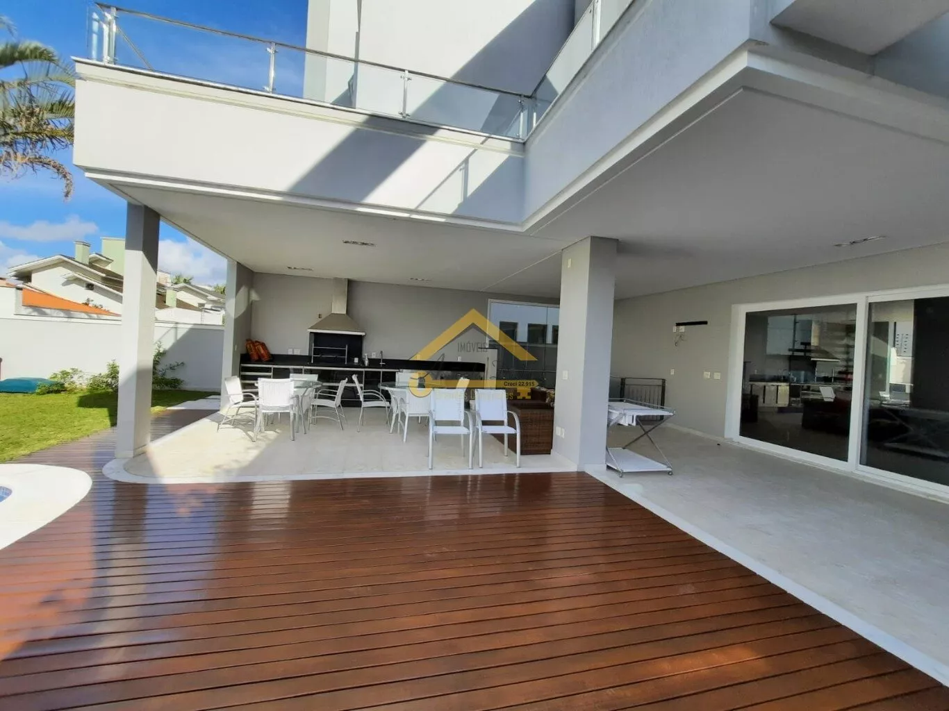 Espaço gourmet com churrasqueira e deck de acesso a piscina.