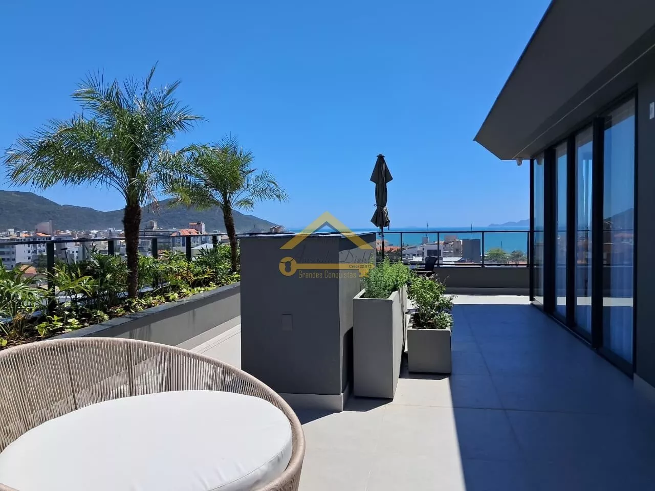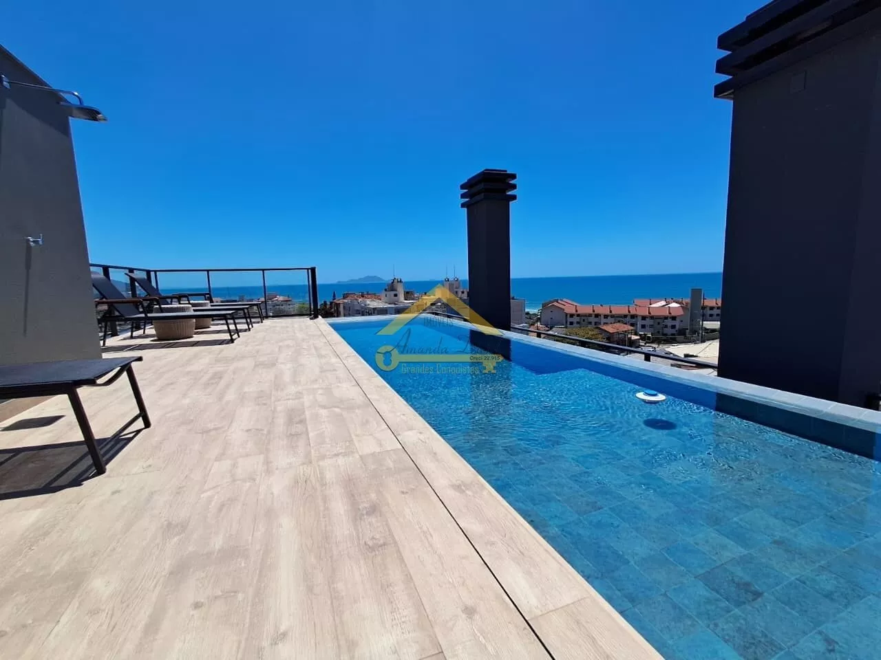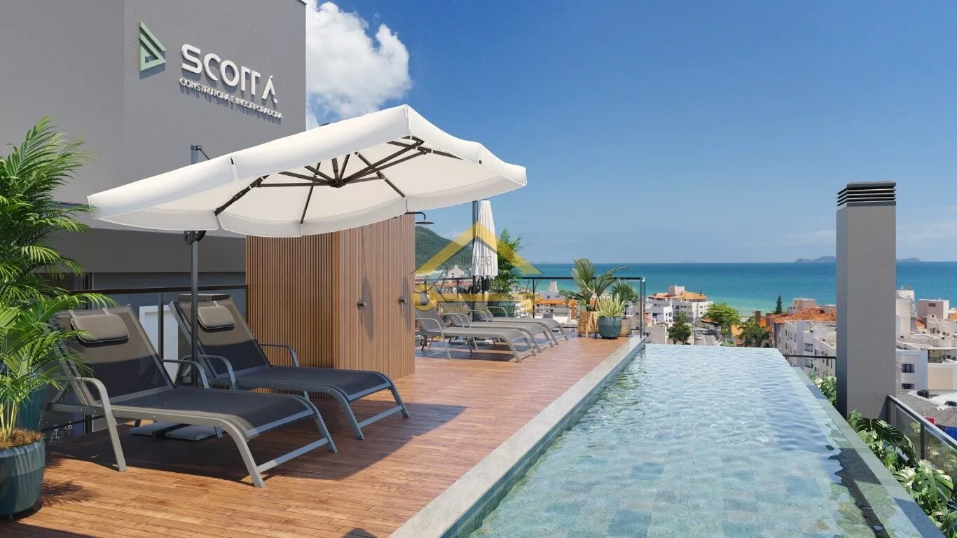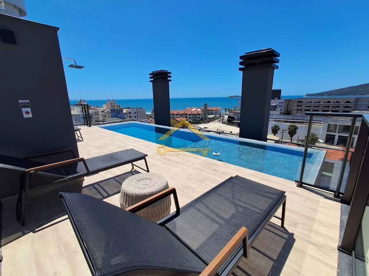 Rooftop com vista mar e área de lazer completa.