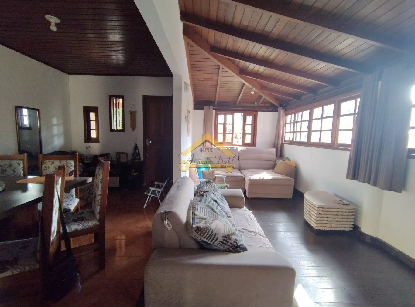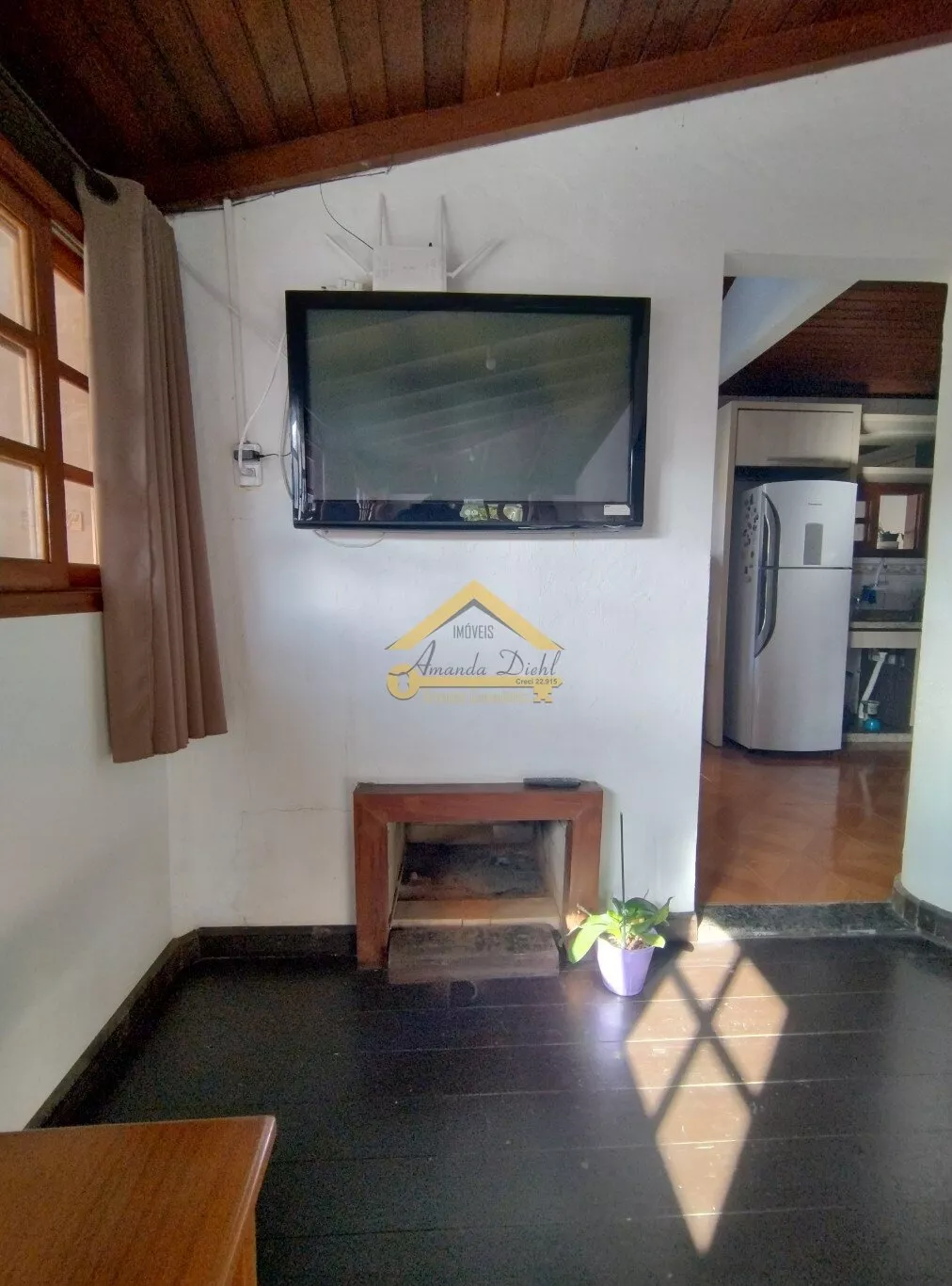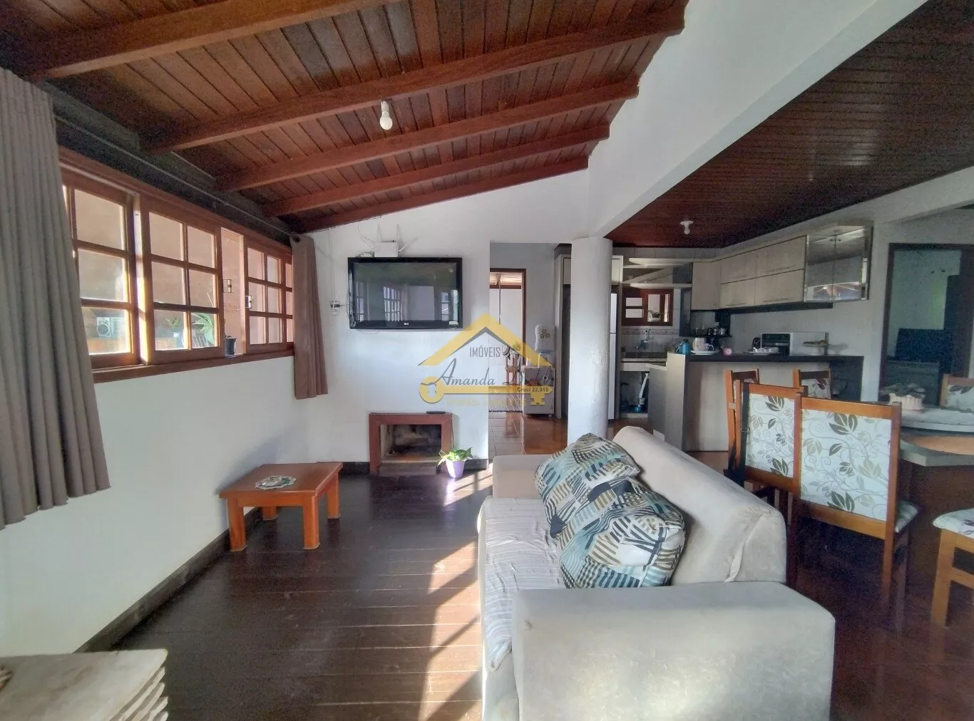 Sala de estar aconchegante com lareira, teto em madeiramento aparente, piso em madeira.