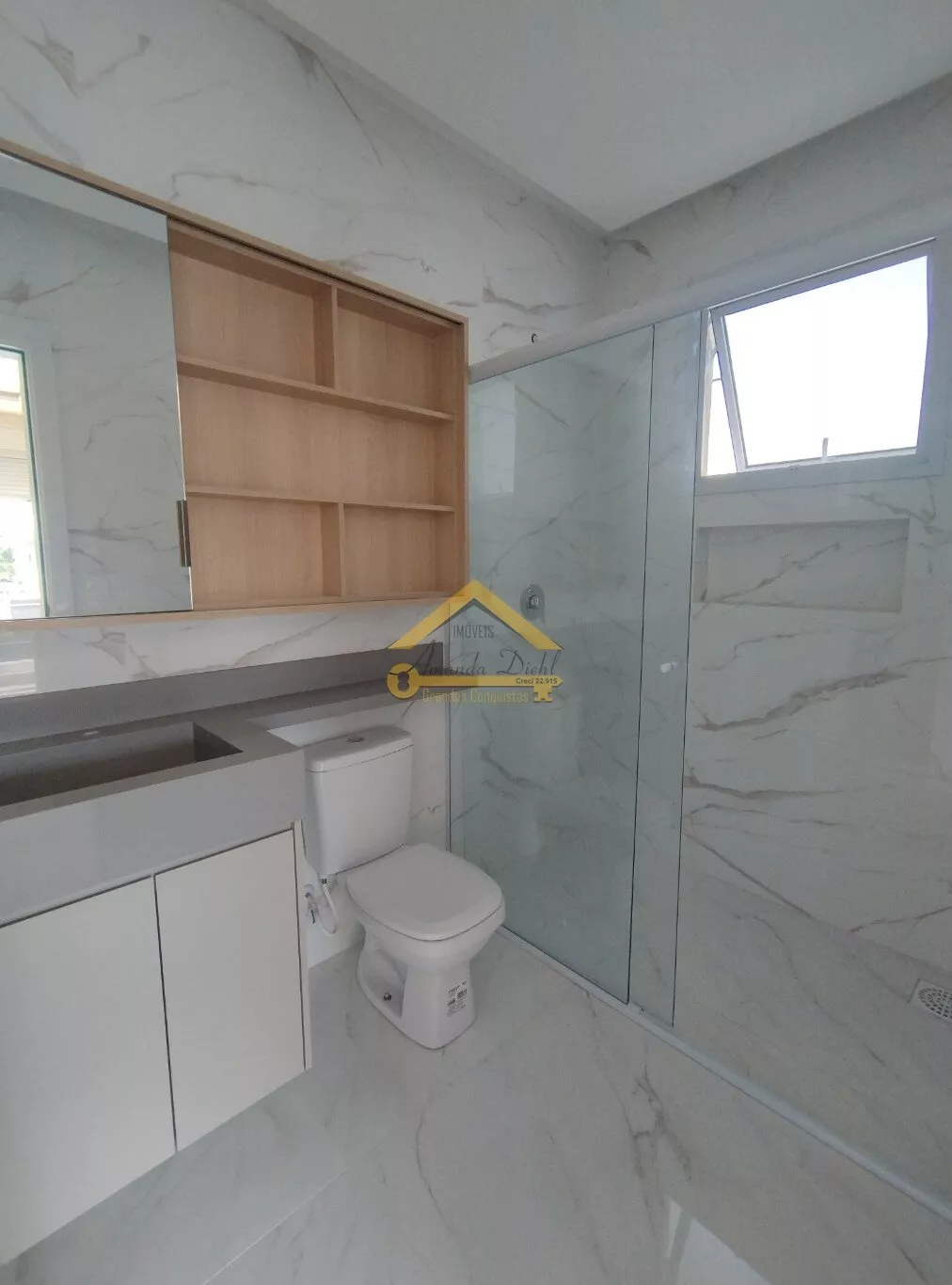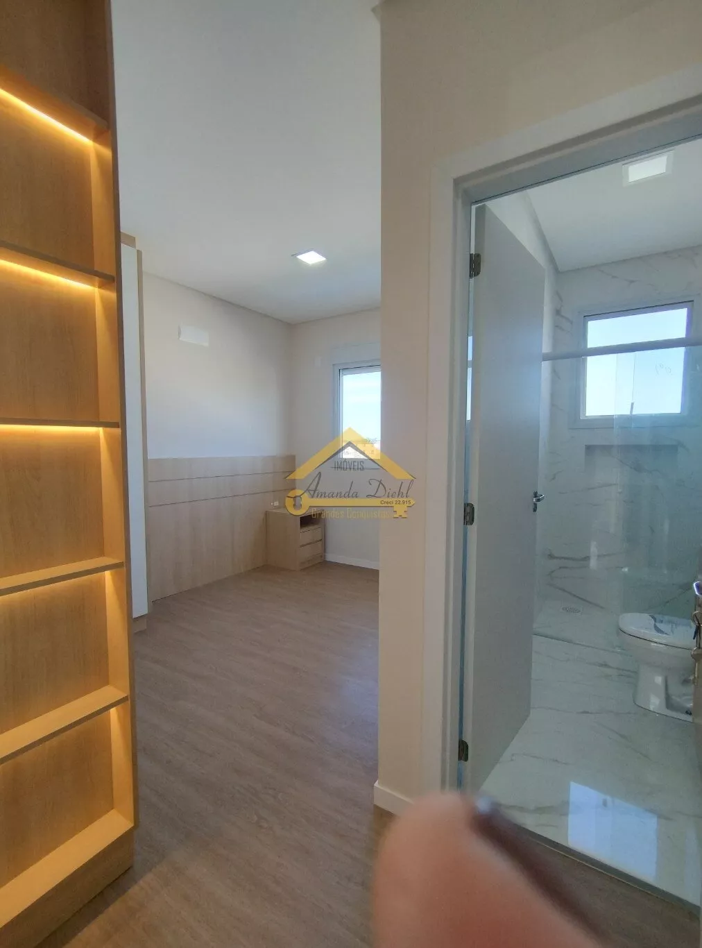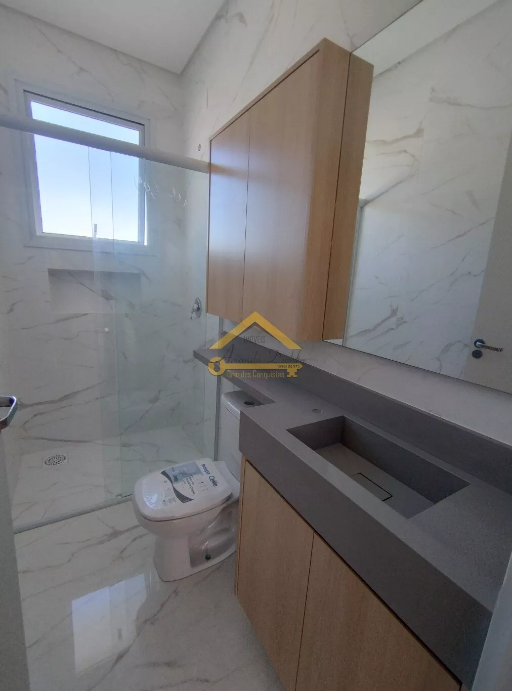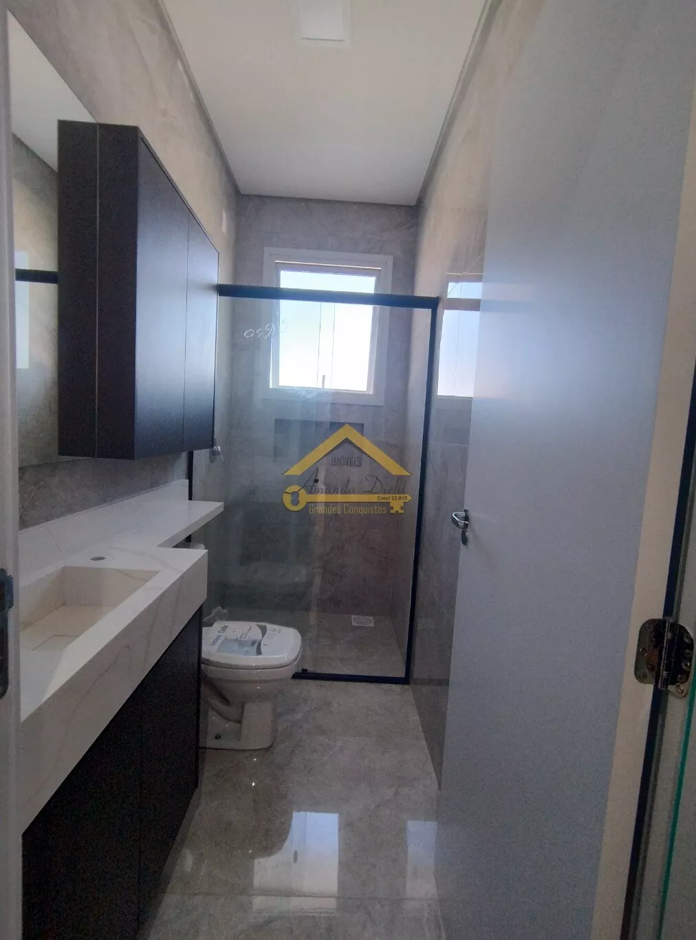 03 suítes no piso superior sendo a master com closet e sacada, banheiro com 2 duchas