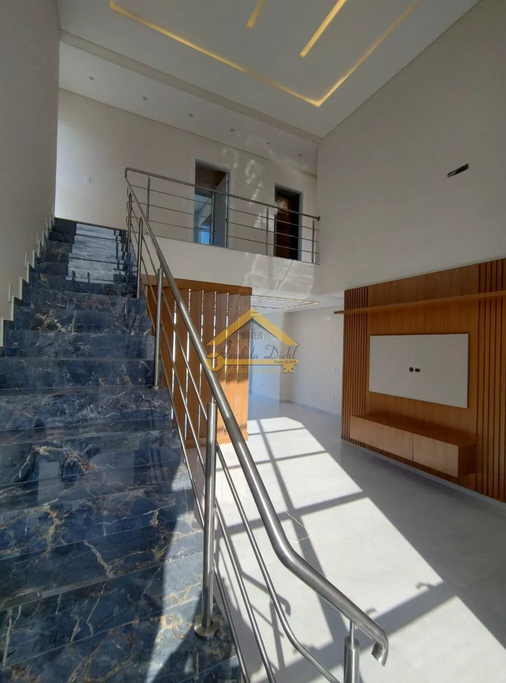 No térreo, sala com pé direito duplo, Cozinha, banheiro social, escritório, Churrasqueira,