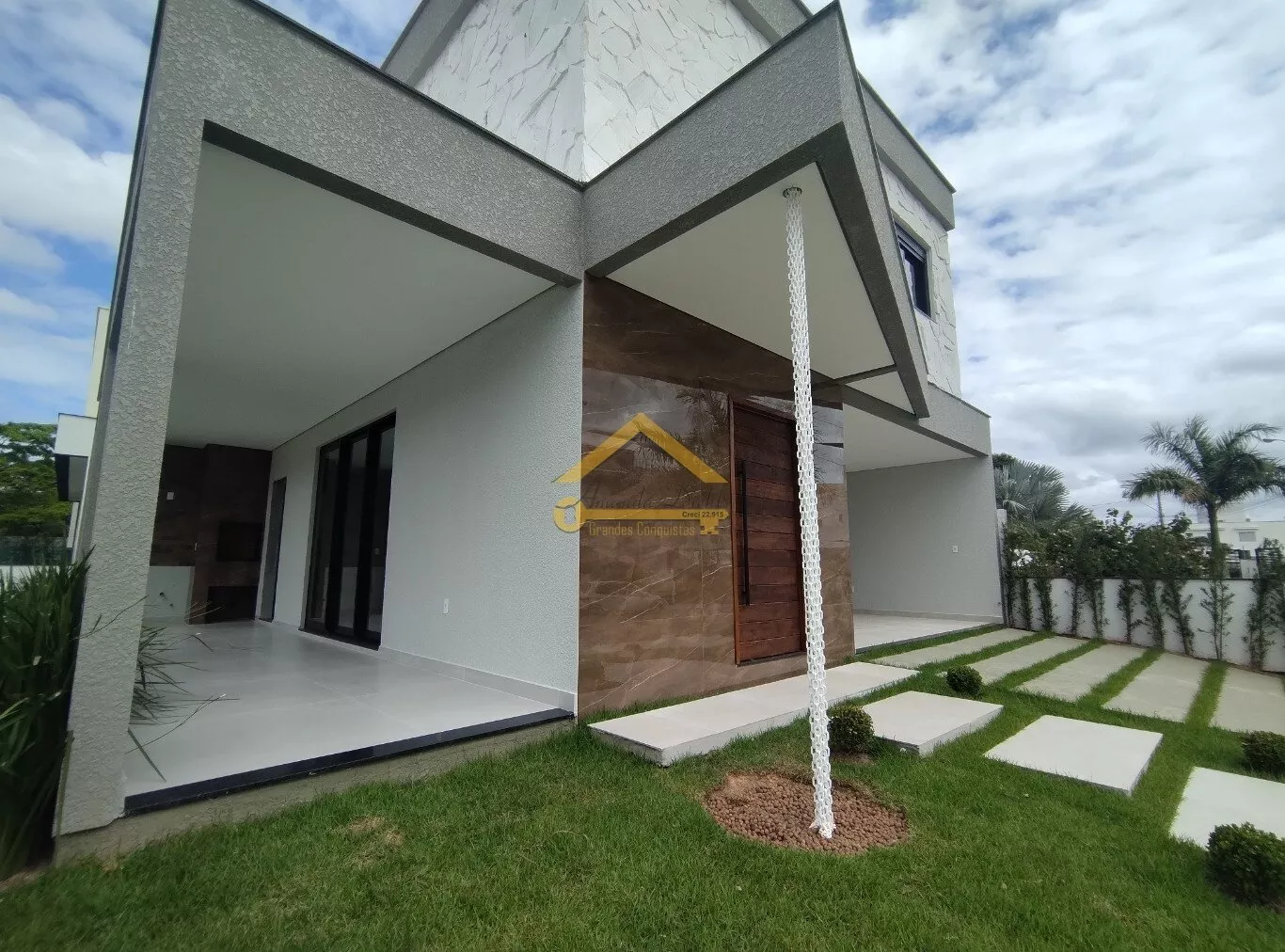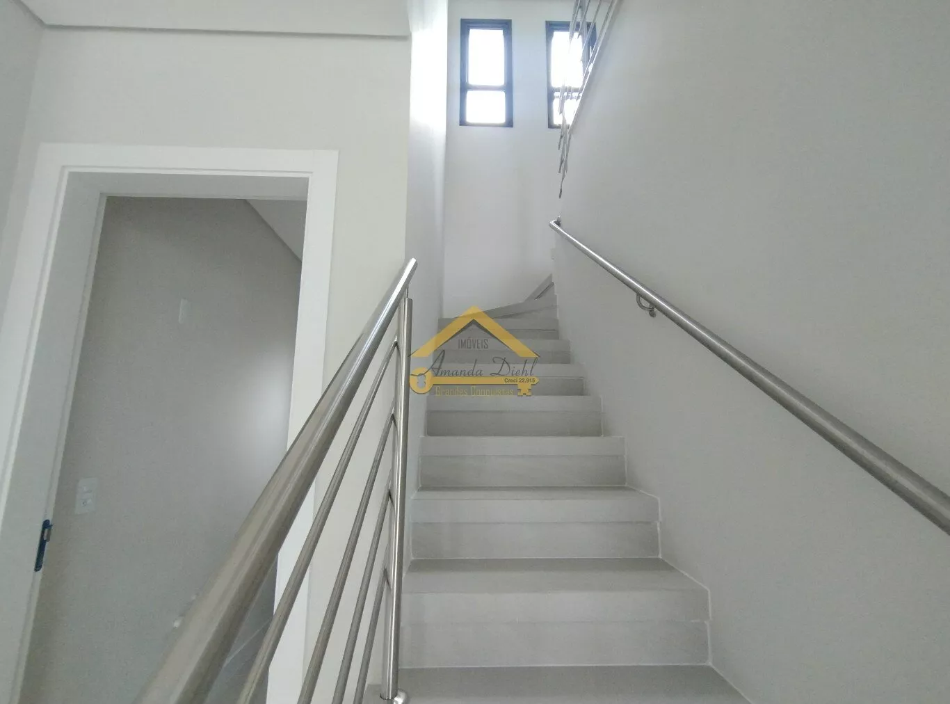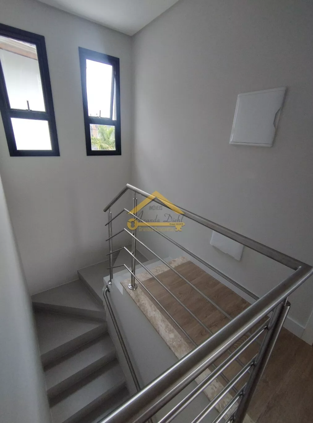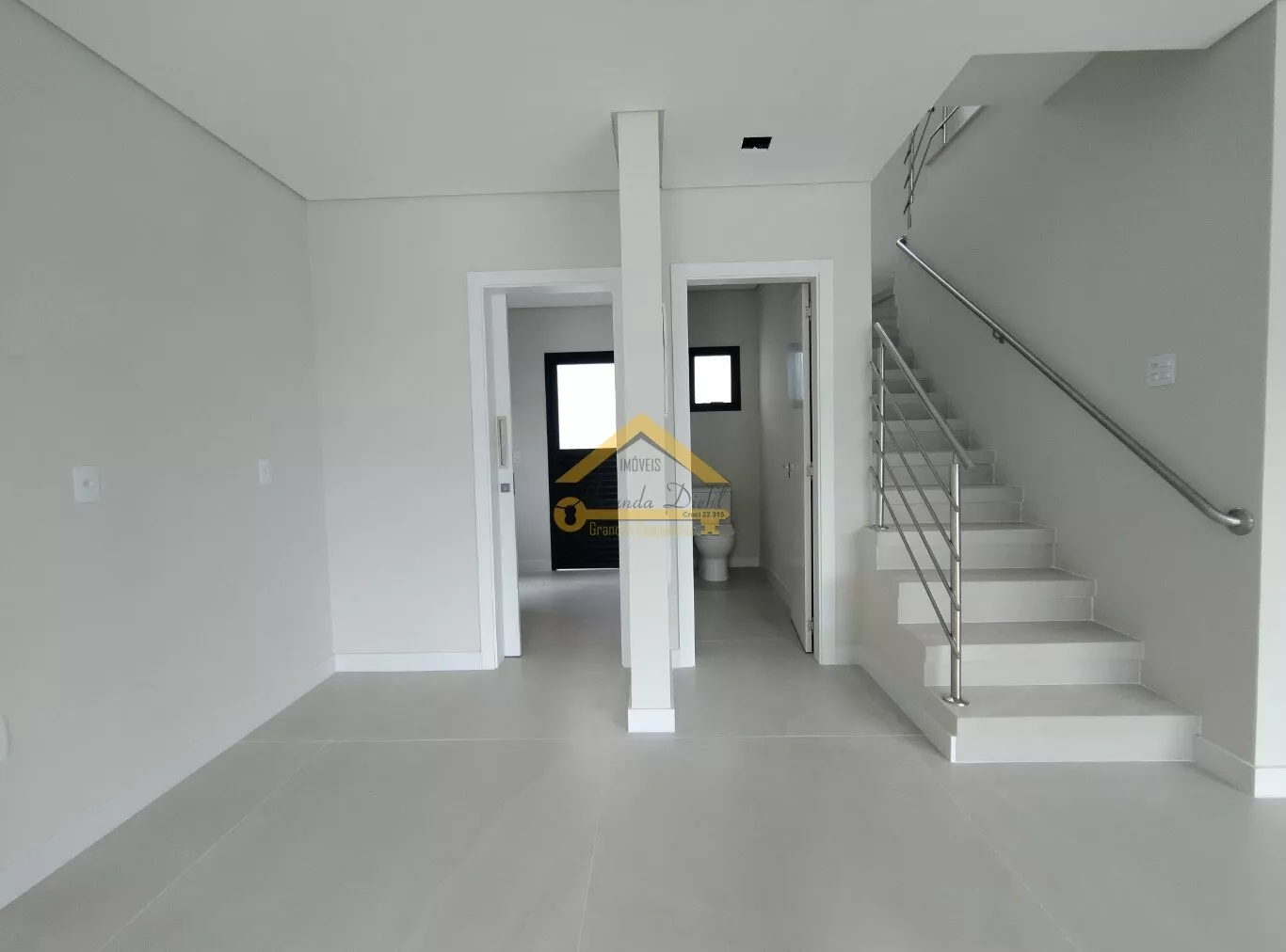 No pavimento inferior, lavabo, sala de estar, cozinha e sala de jantar conjugadas, varanda com churrasqueira, garagem coberta para dois carros e lavanderia.
