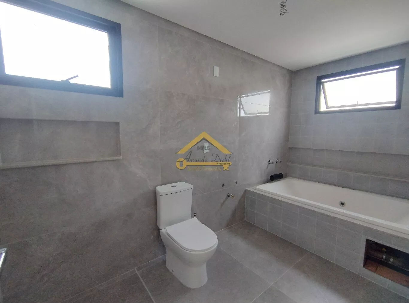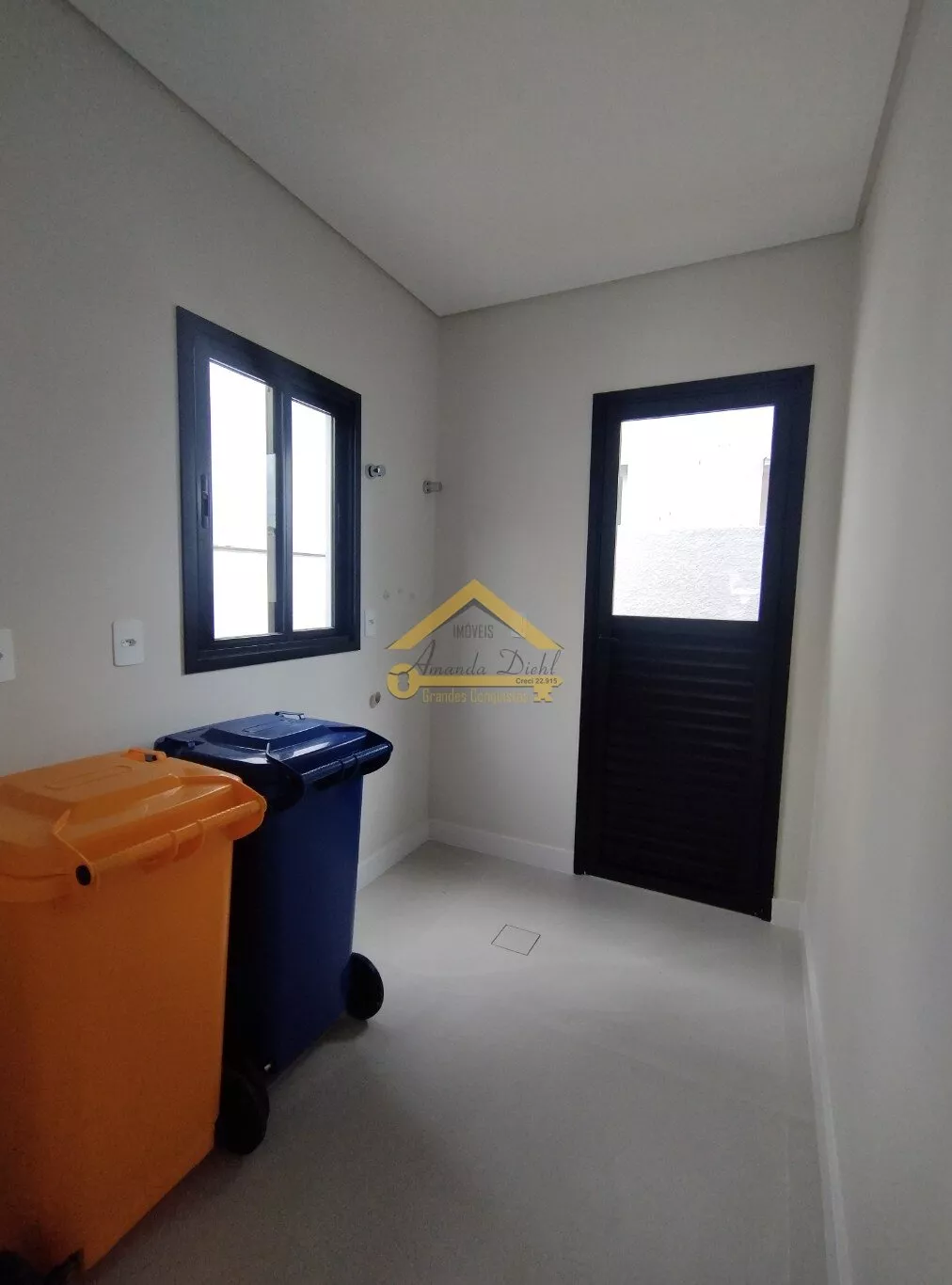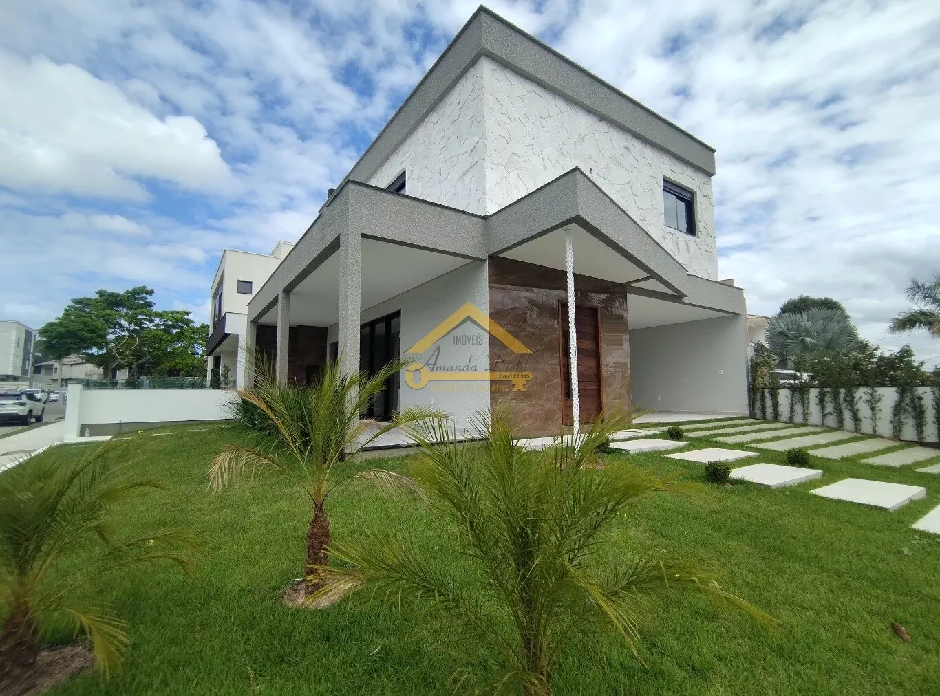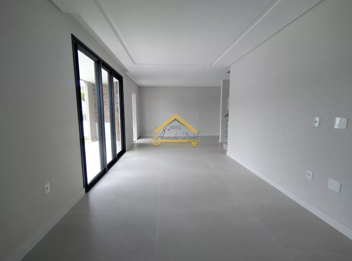 No pavimento inferior, lavabo, sala de estar, cozinha e sala de jantar conjugadas, varanda com churrasqueira, garagem coberta para dois carros e lavanderia.