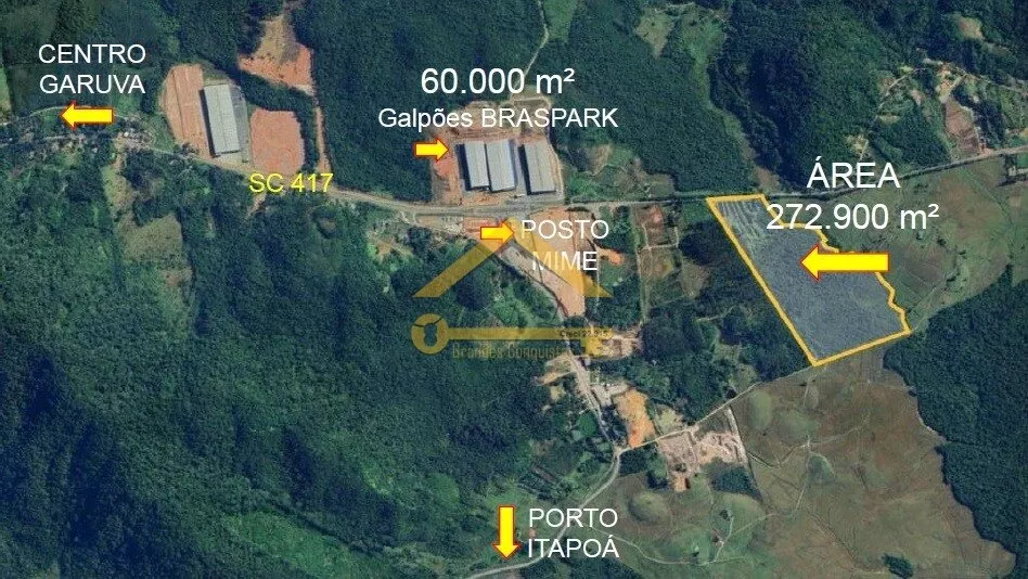 •Excelente Área Industrial contendo 272.900 metros quadrados localizada na SC 417 em Garuva /SC, a 500 metros d o Posto MIME e dos Galpões da BRASPARK.