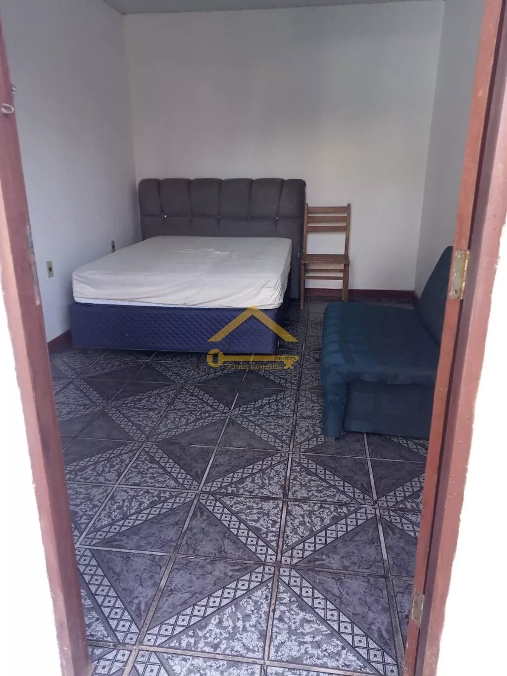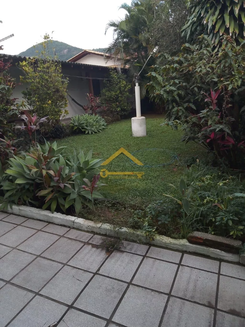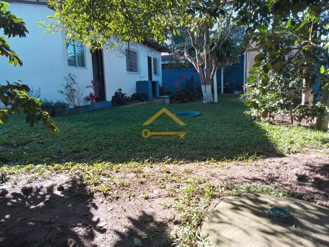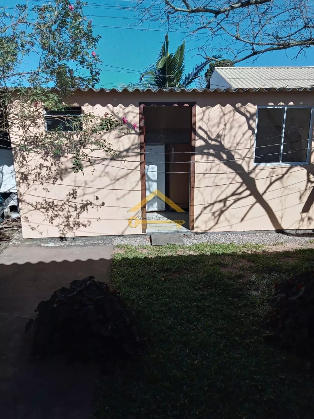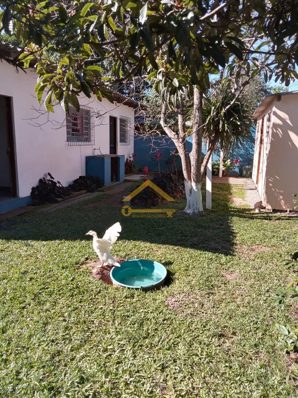 Edícula com cozinha e banheiro social, jardim com árvores frutíferas.