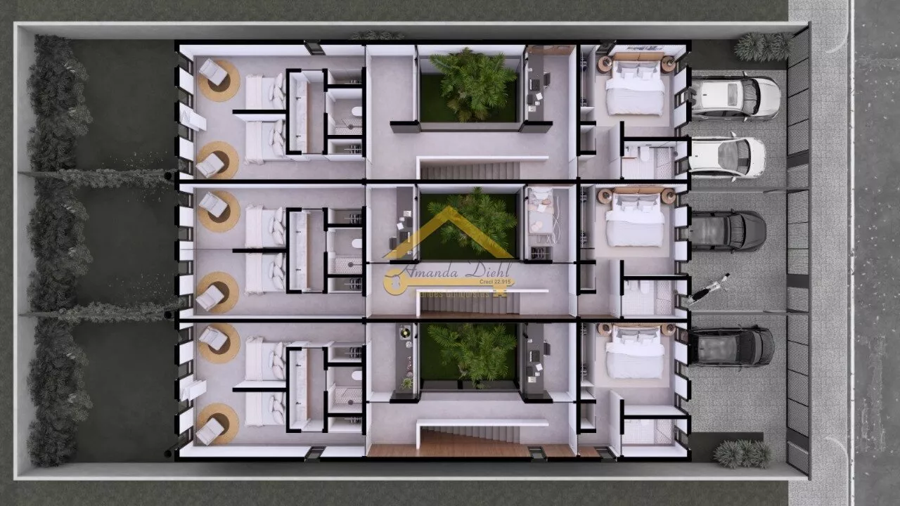 CASA 03: Com área privativa de 250m², sendo 174m² de área construída e 76m² de área descoberta (jardim), a casa é voltada para o sul na fachada, norte nos fundos e leste na lateral.