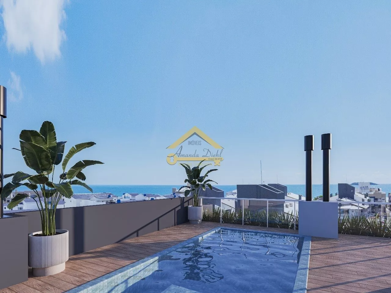 Condominio com elevador panoramico, área de lazer no rooftop com espaço fitness, salão de festas e piscina com vista para o mar.